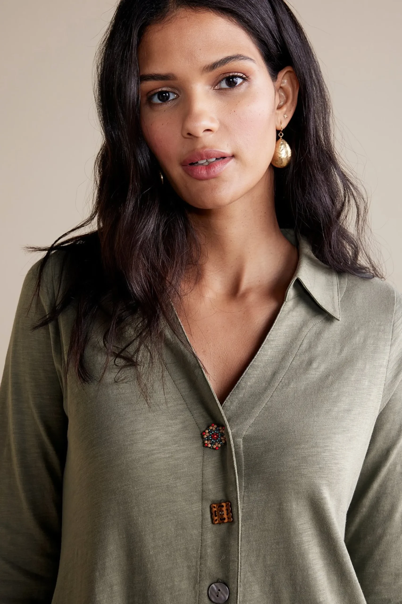Soft Surroundings 3/4 Sleeve Danielle Button Dress> solids|short