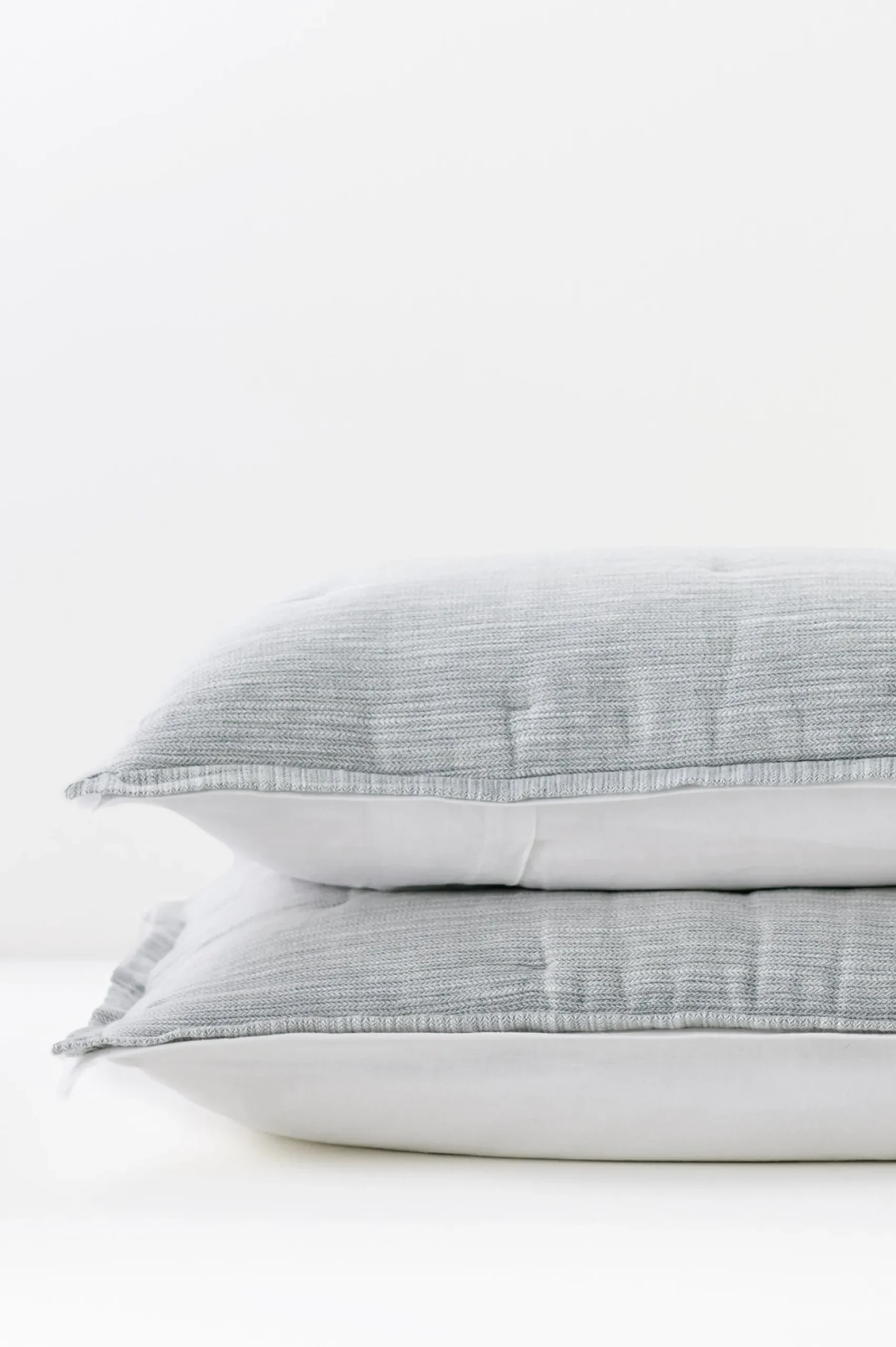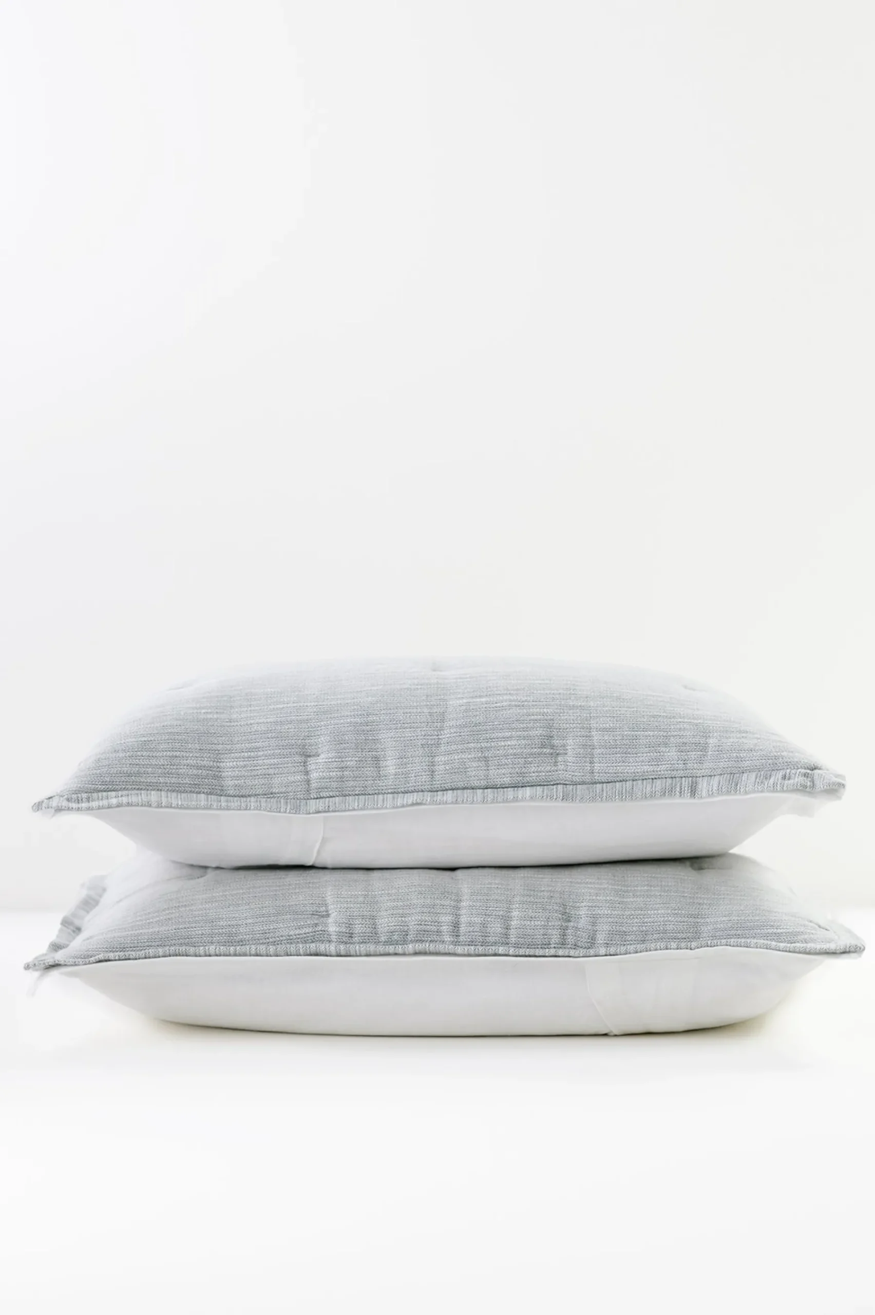 A subtle, striated technique enhances the beautiful texture of this linen and cotton sham in a serene shade of silver sea. The reversible design flips to a sleek, 400-thread count cotton sateen in white.