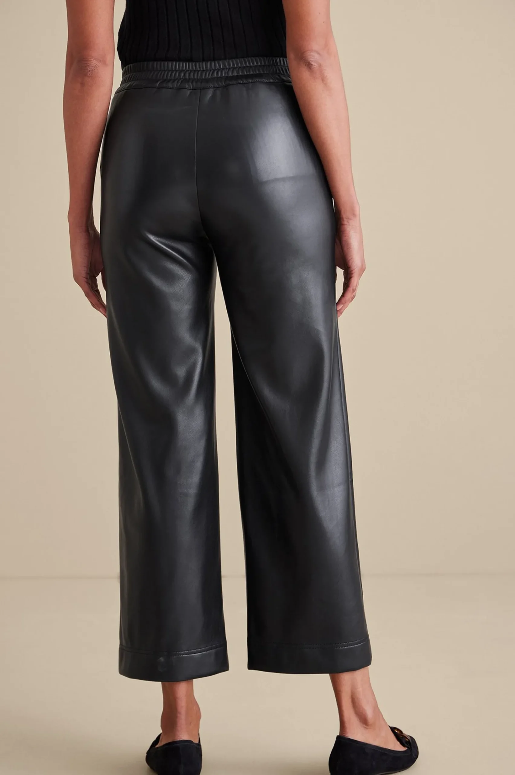Leather pants are endlessly edgy and cool, and this pair takes the trend to a whole new dimension with the softest, drapiest faux leather we could find. In a modern wide leg silhouette with a pintuck running down the front to the deep hem, this cropped pant looks so sleek and fresh. Flat front with comfy back elastic. On-seam pockets. Misses inseam 25″.